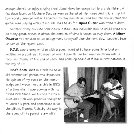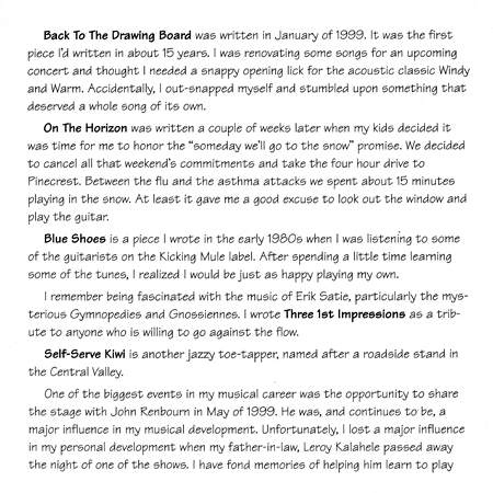 Over the next month or so I took the time to revisit pieces I had written about 15 years earlier and was pleasantly surprised to enjoy playing them. At that point I decided to head back to Joe Weed's studio and record the tunes. I even got my old friend Rich Olson out of retirement to help play Rico's Best Shot.