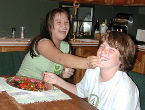 A few hours later it looks like we might have overdone it. Lizzie got a fever (102F) that stayed with her for a couple of hours. This, combined with yesterday morning's headache, has us a little concerned and we call the hospital. The doctor on call tells us to check her incision for any sign of infection but it looks fine. He tells us not to worry unless the fever is still high in the morning. By 11:00 she is asleep, although still pretty warm. Saturday, August 19, 2006 Lizzie has been asking about going out to a movie but we have been a little reluctant to let her visit the mall. We finally figure it might be OK to go to a theater that had a parking lot nearby. We are also not ready to leave her alone so Nani bites the bullet and accompanies the girls to see Step Up. Liz and Rebecca give it a thumbs up and Nani's only complaint is that it's too predictable- probably something that kids like in movies. Later in the evening Lizzie and I get out for a walk. We plan on once around our block, which is about 4/10 of a mile. I know Liz can make it but once again Potsticker and Mu-Shu follow us. I am a little concerned about our little cats hiking that far but they don't seem to understand, "Go home cats!" When we pass Lizzie's friend, Calvin's house, we see him in the window and stop to invite him along. No problem I figure, as they can hang out at our house for a while. I had not counted on the two of them picking up the pace in the interest of catching an 8:00 TV show. This was not a problem for me but the cats were running out of gas. By the time Liz and Calvin were out of sight I was getting puzzled looks from the neighbors. How often do you see a grown man walking his cats? As it was, I even had to stop to let them rest a few times before I coaxed them back up. I can hear it now, "Animal abuser!" By the time I get home Liz and Calvin have settled down near a tomato/basil/mozzarella salad I had made and are starting to dig in community style. Calvin has never liked tomatoes but peer pressure makes him a little more adventurous.
