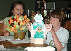 Sunday, August 20, 2006 Today the Lady Sharks teams are having tryouts for the fall season. I leave a little before 8:00am with Rebecca but we are not sure about even letting Lizzie come out at all. As it is, everybody asks about her and I do tell them she'll drop by for a short time later. When she arrives the coaches are looking at 14 year old pitchers and catchers. This is where she would be if she were able to play. Her quick report- a few of them looked OK and a few weren't ready for this level of softball but a couple looked pretty good. (In case any of them are reading this I can't get any more specific). She does have a hard time watching her friends field grounders and fly balls so Nani diverts her attention with a promise of Jamba Juice and off they go. She is smiling when she returns and delivers one to her friend/coach Linnie, just hoping she'll be invited to catch a few balls. Alas, not today, but everybody knows she will be back before we know it. For now, back home to take it easy, doctor's orders. Wednesday, August 23, 2006 We see Dr. Lappen around 9:00 and she is very happy with Lizzie's progress. Her incision is healing beautifully and her color is coming back. She has had no pain to speak of. She tells us Liz can go back to school for an hour or so, even today, which happens to be the 1st day of the year. We need to check up on her at least regularly but this is no problem as we live just around the corner from the school. Lizzie is pumped about being to see some of her old friends again and trade, "What we did on our summer vacation," stories. It is hard to believe that her surgery was only two weeks ago today. The way her schedule is laid out at school is perfect- She has some morning classes that are not as crucial to attend (band, PE and a rotating elective) then her four core classes, two before lunch and two after. We figure we can take her to the 1st core class today around 11:15 and play it by ear. We also had been trying to schedule a family lunch out with the five of us over the last few days and decide to make it breakfast today. Seems like an obvious opportunity to Nani and me but when we call home to get Cory and Rebecca to join us we realize we had a couple of sleeping teenagers to deal with. A few phone calls later we are waiting patiently at The Flames and continually telling the waitress we really are expecting two more in our party. Eventually they show up and we all had a great, relaxing time just hanging out together- something that has certainly become less common over the last few years as the kids get older, more independent, and more involved in their own lives. A little after 11:00 we check into the school office and head off to her class. Dr. Lappen had told us the only restrictions were no carrying anything heavier than a phone book and to stay away from anyone with a cough or cold. As we walk across the school yard Lizzie is greeted by many of her buddies but seems a little shy. We tell her she is going to have to come out of her shell and answer their questions as well as she can. In just a few minutes she takes off to say hello to Calvin and we yell across the lawn that we'll check back after class, in about 50 minutes. She waves goodbye with a familiar, "See ya' and get lost," look in her eye. We return around noon, not sure if she'll be ready to come home or stay all day. We had already decided that two classes would be the absolute max for today but if she was the slightest bit tired we would take her home now. Not surprisingly she sees us coming, says she feels great and we should go home. I get a glimpse of the smile I have not seen for a few weeks- it is clear she is very happy to be back in the comfortable surroundings of school and her friends. Another 45 minutes later we come back and get the same story- she wants to stick around for lunch. We had already decided that we would rather take her home too early than too late. We hope to make the other two core classes tomorrow so we are leaving, feeling like it was a very successful trip. Lizzie spends the rest of the day around the house, then runs some errands with Nani and Rebecca, before finally getting into the shower late in the evening, something she has been looking forward to since getting home from the hospital. A day with nothing but positive milestones. Friday, August 25, 2006 A few minutes before I need to head over to the school I remember that I said I would bring her a sandwich so I ask Rebecca to throw together one of Lizzie's favorites- turkey, mayo, and bread- simple but tasty. Rebecca looks at me with a, "You have got to be kidding!" stare, but says she can probably handle the special order. I squeeze in a quick shower and when I return to the kitchen she is eating one of her own, "It looked so good," she said, as she was cutting Lizzie's sandwich into six perfectly matched pieces. She had to include a note, "Lizzie, I made this sandwich just for you. Hope you're sternum feels better. (signed) Rebecca K.K. Hogan- aka your sister whom you love." I got to the school a few minutes later, handed Liz the sandwich, and she had a good laugh over the note. She told me she wanted to stay for one more class as she had a math test to finish, and we agreed that I would come back in an hour to take her home. It was great to see her hanging out with her friends at lunchtime, again looking as if nothing unusual had happened over the last two weeks. I was running a little late an hour later and by the time I got to the office she was sitting there ready to go. It looks like today she did just the right amount of time at school and now we should head home for a little couch time. I continue to be amazed at her recovery but I think we both look forward to a weekend of rest. Tangent Alert - Lizzie seems to be showing no signs of the kind of pain or discomfort you might associate with open heart surgery. This afternoon she brought up the fact that she needs a cell phone. I remind her 